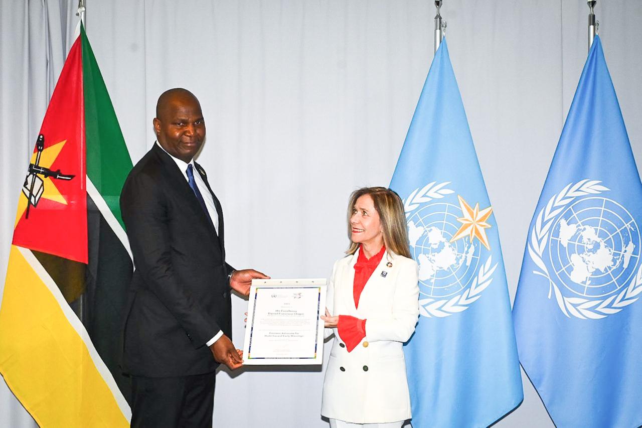No final da cerimónia, Celeste Saulo, secretária-geral da OMM, entregou ao Chefe do Estado um certificado com letras azuis e douradas. O documento consagra Chapo como “Eminent Advocate for Multi-Hazard Early Warnings” ou, em português, Defensor Eminente dos Sistemas de Alerta Multirriscos.