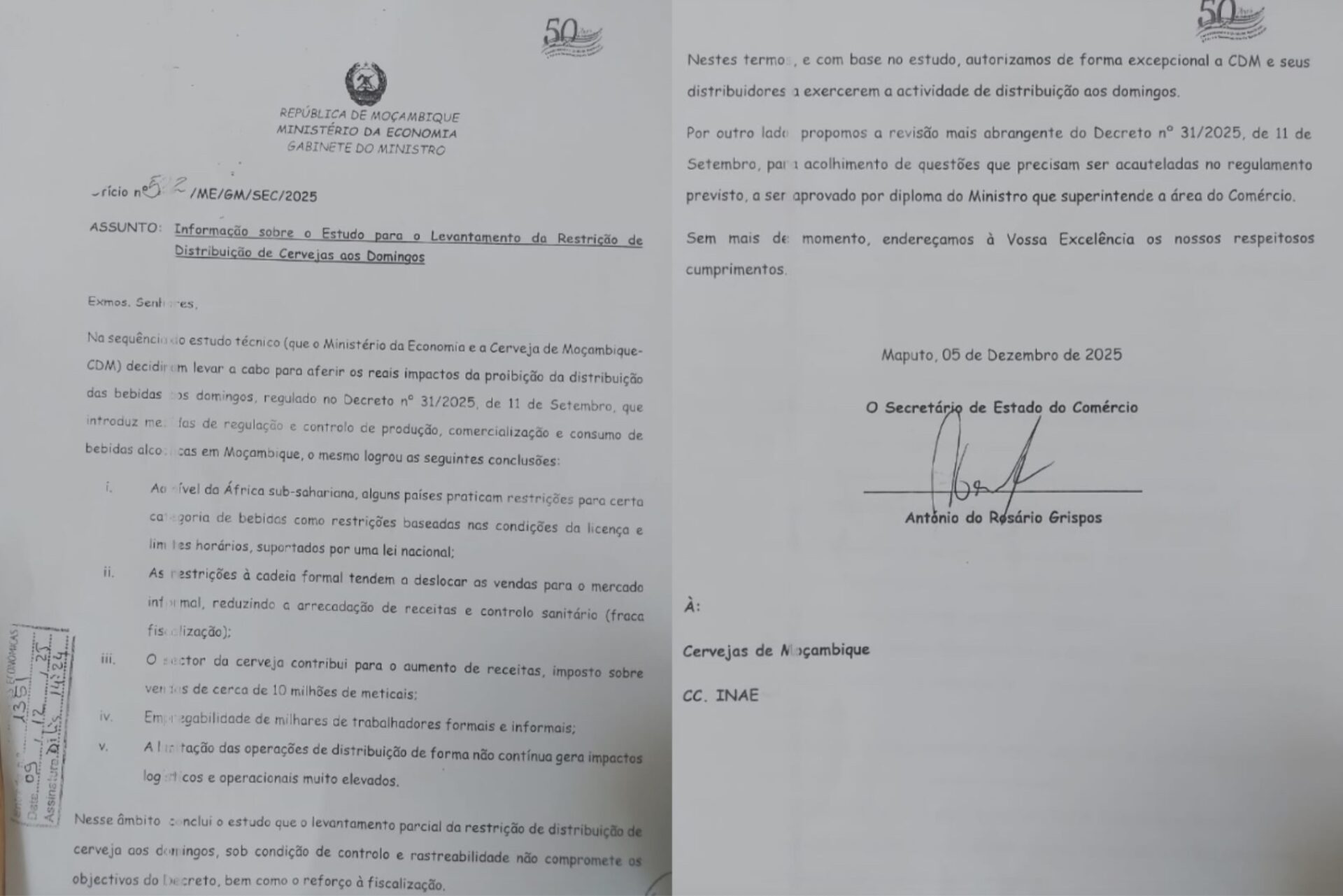 Num despacho excepcional datado de 5 de Dezembro de 2025, o secretário de Estado do Comércio, António do Rosário Grispos, autorizou a Cervejas de Moçambique (CDM) e seus distribuidores a retomarem a actividade de distribuição de bebidas aos domingos, suspendendo parcialmente para esta empresa uma das medidas do polémico Decreto n.º 31/2025. A decisão, baseada […]