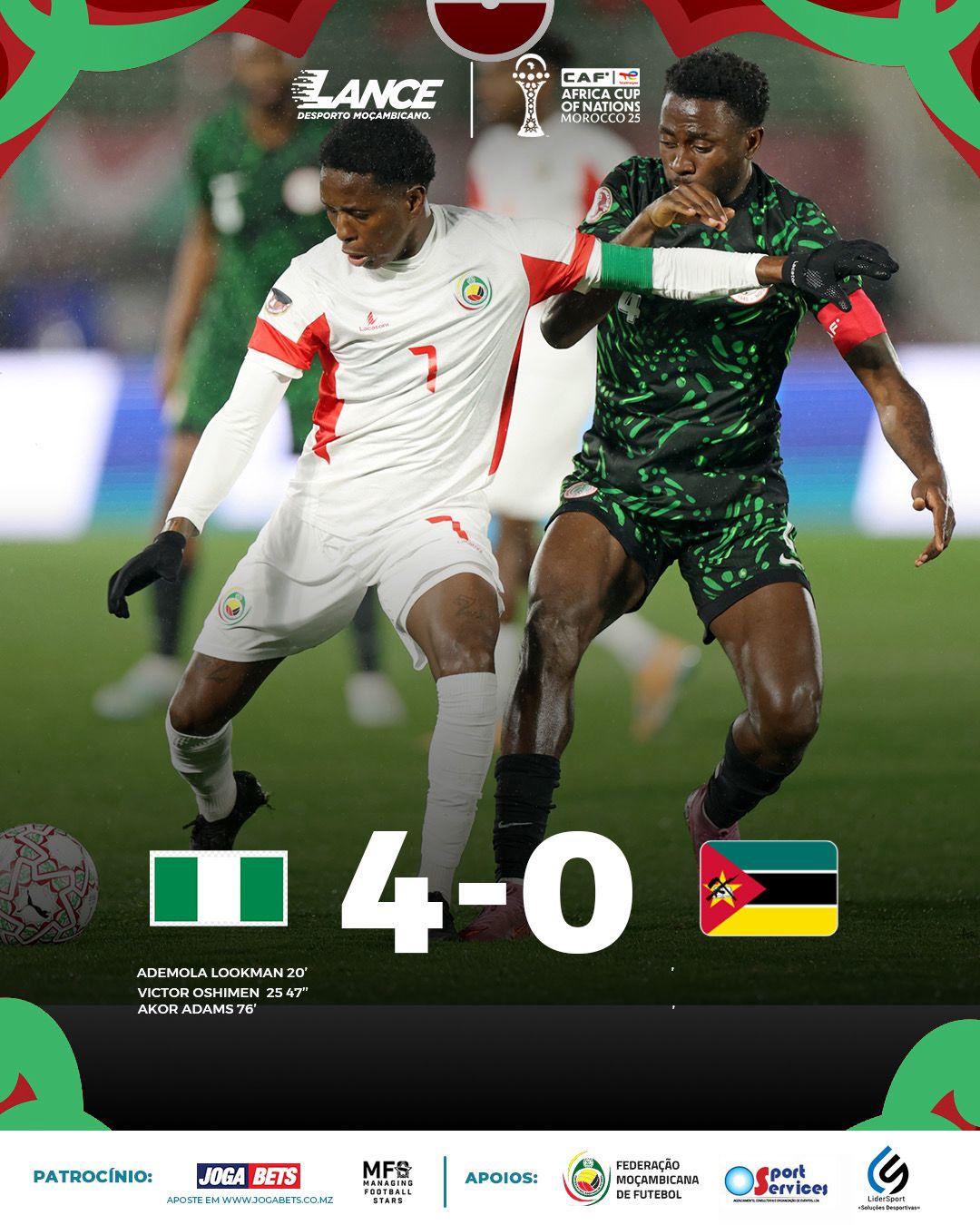 Moçambique despediu-se da Taça Africana das Nações (CAN) 2025 após perder, esta segunda-feira, diante da Nigéria, por 4-0, em jogo referente aos oitavos de final da competição. Na primeira parte do encontro, a selecção moçambicana não conseguiu concretizar as oportunidades criadas, enquanto a Nigéria demonstrou maior eficácia ofensiva, alcançando dois golos antes do intervalo. No […]