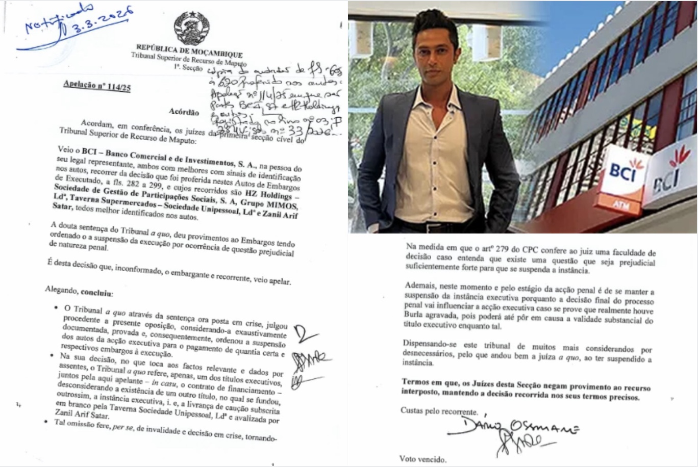 Numa disputa jurídica que opõe um dos maiores bancos do país ao empresário Zanil Satar, o Tribunal Superior de Recurso de Maputo decidiu, em acórdão datado de 12 de Fevereiro de 2026, manter suspensa a acção executiva movida pelo BCI contra a HZ Holdings.