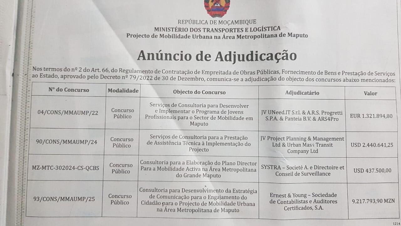 O Ministro dos Transportes e Logística, João Matlombe, determinou a suspensão imediata de quatro contractos de consultoria para o Projecto de Mobilidade Urbana na Área Metropolitana de Maputo. A decisão surge menos de 72 horas após a publicação de uma reportagem detalhada pelo jornal Evidências, que revelava um gasto total de aproximadamente 280 milhões de meticais (4,3 milhões de dólares) em serviços de assessoria técnica e estratégica. De acordo com o despacho ministerial, a medida foi necessária porque os termos de financiamento e os processos concursais não foram submetidos à aprovação prévia da tutela, violando as competências estabelecidas pelo Decreto n.º 18/2025.