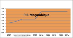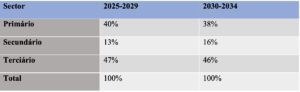 A tabela mostra a distribuição esperada do PIB pelo sector e deverá se registar uma transição duma economia agrícola e de exploração de matérias-primas para uma economia industrial e virada para os serviços. A tabela indica uma redução da contribuição do sector primário (incluindo GNL) que passará de 40% no primeiro quinquénio (2025-2029) para 38% no segundo (2030-2034). No período em análise verificar-se-á uma evolução significativa do sector secundário de 13% no primeiro quinquénio para 16% no segundo. No período em alusão espera-se um abrandamento da indústria dos serviços de 47% para 46%, respectivamente.